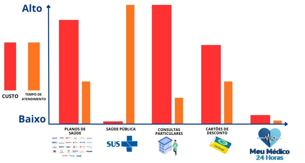 Quando você compara, a diferença fica evidente: planos de saúde são caros, o SUS demora, consultas particulares pesam no bolso e cartões de desconto entregam pouco. O Meu Médico 24 Horas une o melhor dos dois mundos: baixo custo e atendimento rápido. Com poucos cliques no celular, você fala com um médico em minutos, 24h por dia, sempre que precisar.